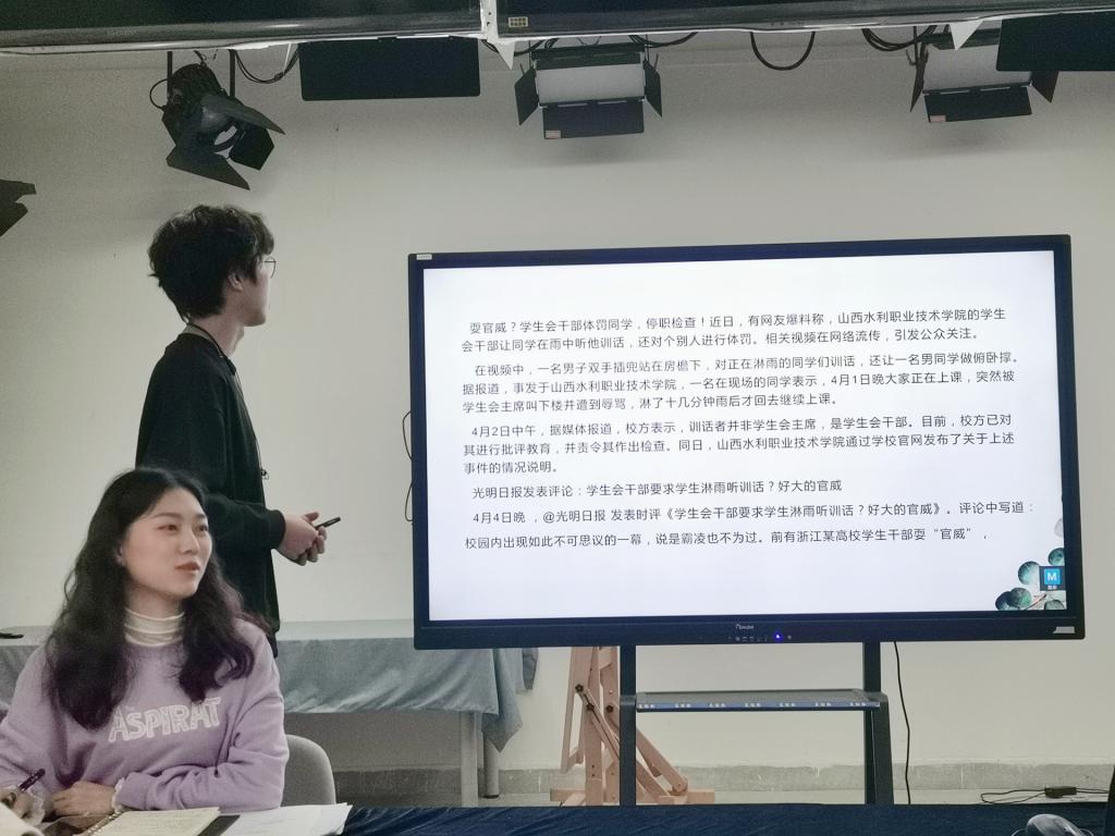 随后,辅导员曾老师以“山西水利职业技术公司员工会干部体罚同学”为反面典型,展开警示教育,并围绕“员工干部有偿帮助其他同学做事”开展讨论。大家纷纷表示,作为一名员工干部应力所能及帮助有困难的同学,这是员工干部的本分,不应该寻求报酬。通过案例学习,加强警示教育,提高员工觉悟。