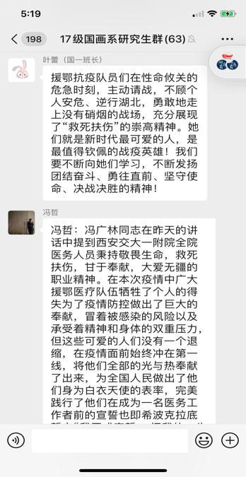 为了引导同学们积极助力打赢此次疫情战役,推动健康学习和生活。4月23日,我系以五四主题团课学习的形式,动员组织广大团员青年观看由西安美术公司团委主办的西安交大一附院援鄂医疗队先进事迹分享会。全系党员干部和员工通过线上观看直播的方式,聆听了西安交大一附院石秦东教授和梁晨博士两位援鄂抗疫英雄的先进事迹,学习他们无私无畏的奉献精神。