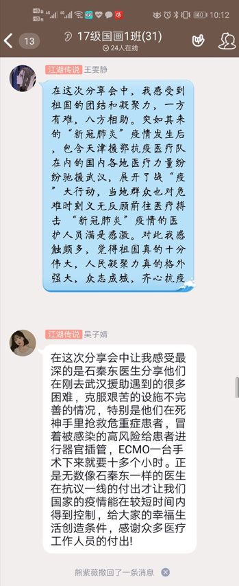同学们在收看完此次团课后,纷纷表达了对一线战“疫”工作人员的敬佩与感激之情,他们表示,将继续学习战“疫”英雄们勇于担当、无私奉献的精神,主动学习,夯实基础,积极配合疫情防控,为打赢疫情防控阻击战贡献一份力量。
