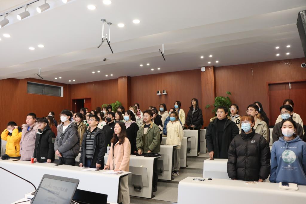 大会在庄严的国歌声中拉开序幕,主持人桂蔓青首先对本次大会的流程和目的进行介绍。一是共同回顾本学期工作开展情况,由分团委和员工会各部门负责人作工作报告,总结不足,展望未来;二是由辅导员曾艳老师进行总结发言,公布分团委员工会一级评议结果。