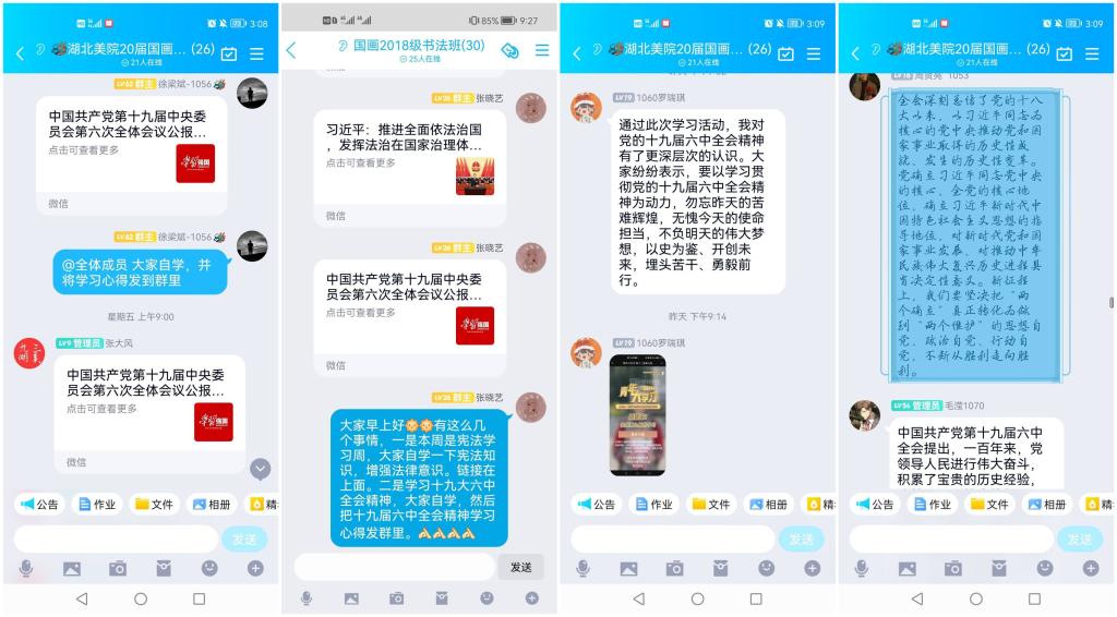 各班班导师和团支书共同带领带同学们学习十九届六中全会精神,同学们主动学习团支书在班级群内发布的文件,并积极发言和讨论,充满了浓厚的学习氛围。taptap点点体育团委书记曾艳老师在团支书群里强调:“各级团干部要带头学习,切实把全团的思想和行动统一到全会精神上来,带领同学们深入学习、深刻领会、准确把握全会精神的丰富内涵与核心要义。”