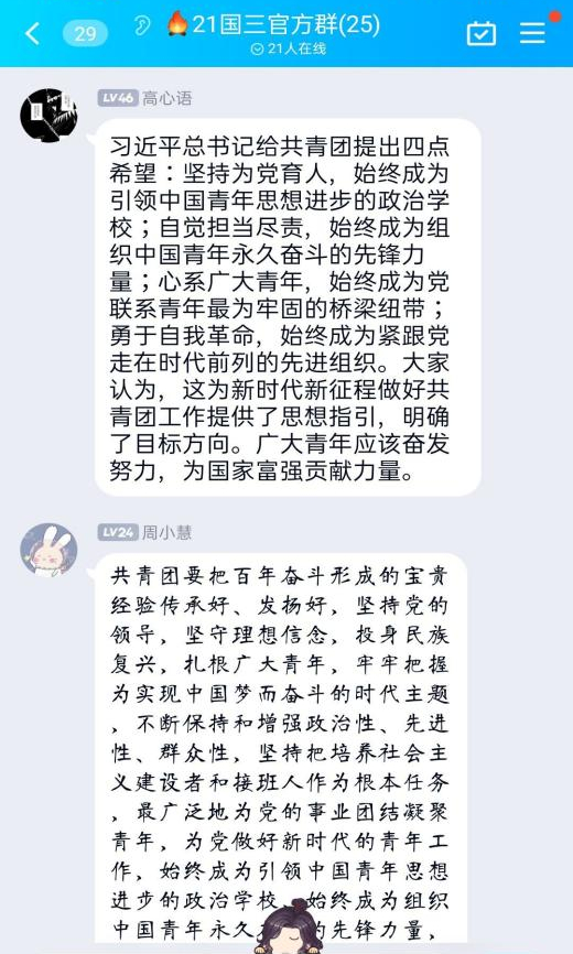 21级国画二班谢信琪:通过两次习近平总书记的重要讲话,我最深有感触的是作为新青年我们应该在党的领导下做社会主义核心价值观的坚定信仰者和模范践行者。要做有共情力的新青年,用心对待群众,做到情感上共情,工作上积极入情,做到实践上共情,才能共同创造更美好的明天!