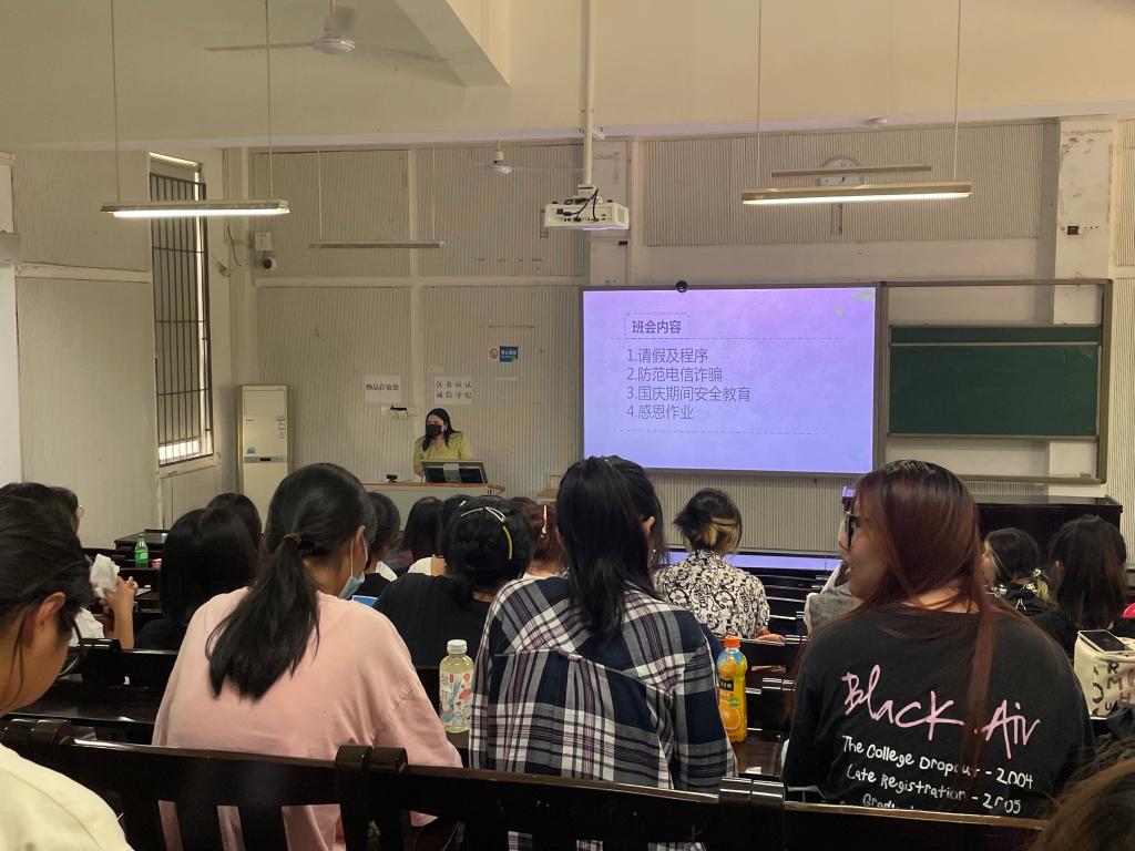本次班会主要围绕国庆假期安全教育,重点强调以下几个方面。一是消防安全,假期留校员工较多,要注意寝室、教室用电安全,加强安全排查,及时消除安全隐患;二是交通安全,做好申请外出员工摸排和统计,注意交通安全和人生安全;三是财产安全,提醒同学们要注意电信诈骗,牢记“八个凡是”,及时参与星空杯防诈骗学习;四是严格落实疫情防控要求,假期人员流动较大,坚持“非必要不出校”“非必要不出市”的原则,减少外出,减少聚集,特殊情况申请外出员工做好防护措施,以及返校要求及管理措施。