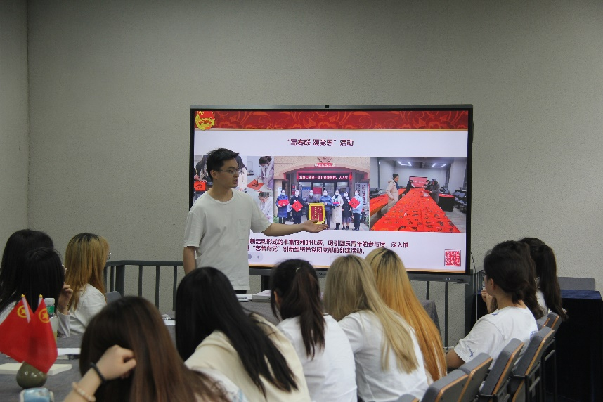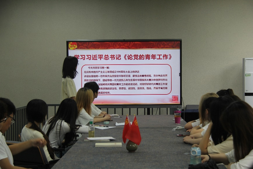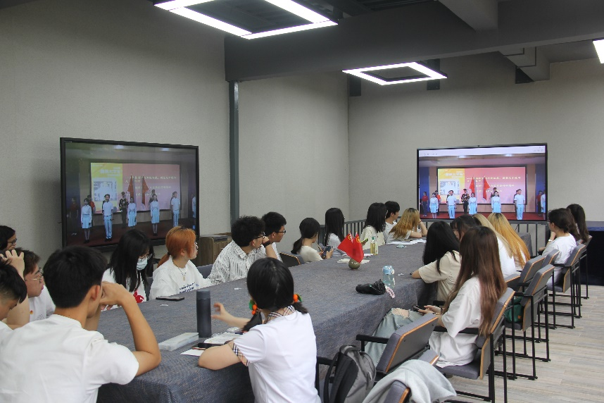 所有会场全体起立唱国歌,新成员在主会场进行宣誓并发表演讲。主会场表演朗诵和心雨话剧社表演话剧,随后为优秀团体和优秀个人颁奖,表彰获奖成员。分别由活力团支部和艺术点亮红土地进行风采展示。直播结束后,分会场由员工会干部范清雨开始领学《论党的青年工作》,在这篇讲话中,习近平总书记表示,共青团一直在带领广大团员青年面向未来,创立新功,他们的带头作用正是社会主义建设成就显著的原因之一,所以我们一定要再接再厉,不辜负党、祖国、人民的期望。