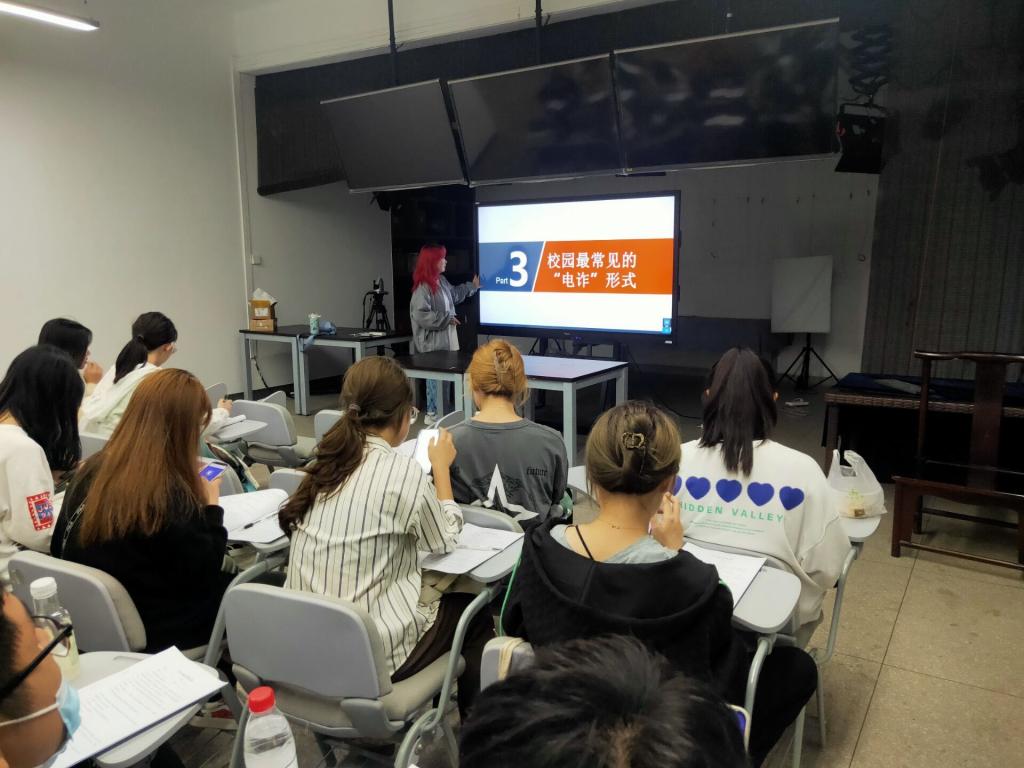 此次班会由各班团支书主持,以PPT的形式展示校园安全防护小课堂的内容。首先,团支书放映了两段电信诈骗犯罪嫌疑人落网的视频并引出班会主题,警醒同学们电信诈骗的普遍性。在简要说明本次活动流程之后,依次介绍了什么是电信诈骗、犯罪率最高的骗术、校园内常见的电诈手段与最新型的电诈四部分,令同学们对电诈有了充分认识。紧接着列举数个身边真实案例,展现电信诈骗的多样性与防诈的重要性。