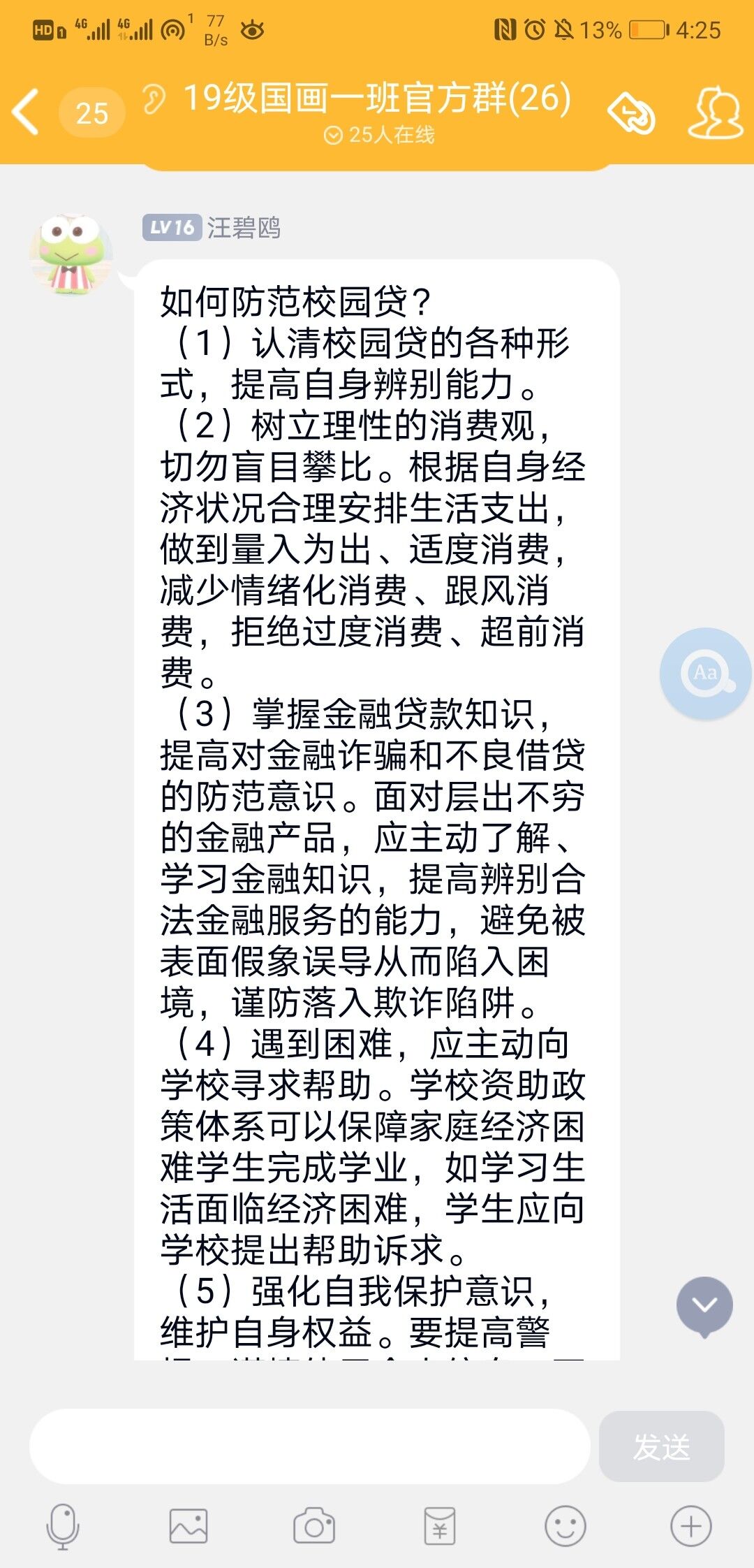 讲座过后,辅导员安排各班班长组织同学们在班级群里进行讨论对本次讲座的学习心得和体会。大家看完讲座后纷纷表示感触很深,大部分同学认为我们应该树立正确的消费观,远离校园贷。面对那些“益处多多”的选择时,我们不应该轻信,要擦亮双眼看清这些“美丽”背后蕴含的本质——校园贷背后越滚越大的暴利。所以我们要保持本心、拒绝诱惑才是正确之选。
