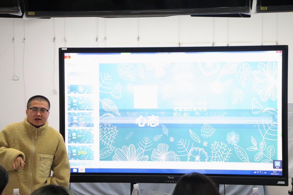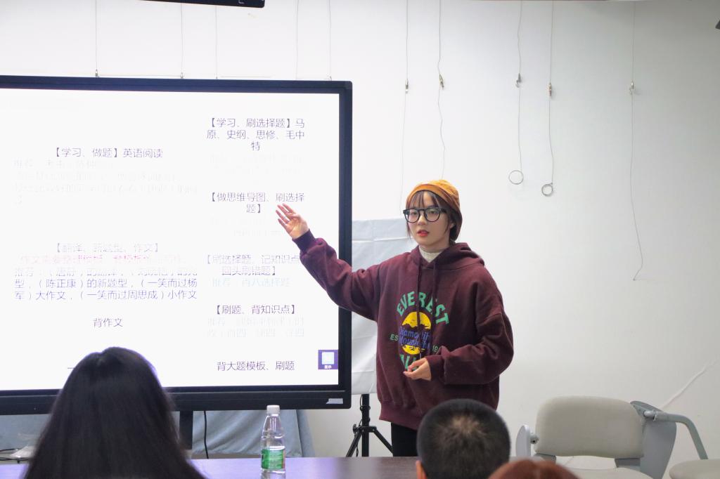 叶朗佑同学回顾了自己考研经历,对各科目学习的学习方法做了自己的归纳,用简洁概括的方式讲述了考研的难度,使同学们对考研更有信心;李安幸同学运用图文并茂的方式从英语、政治和专业课学习上作了详细的讲述,加深了同学们对于考研时间上的规划意识;刘猜同学以独到的时间观视角,从考研的不同阶段来分析备考具体内容和考研备战各个阶段的不同侧重点;胡域亭同学提出了“集中精力去攻克一个问题”的观点,并给同学们分享了在英语和政治科目应试的小技巧;夏翔宇同学则从考研的心态着手,鼓励同学们要有一战成“研”,绝不给自己留后路、破釜沉舟的决心和勇气。