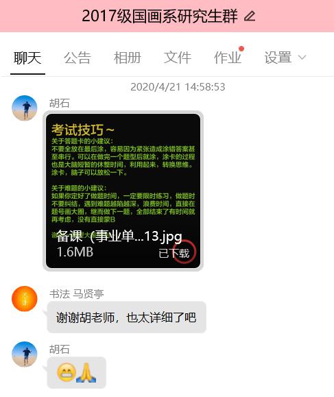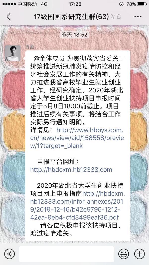 (通讯员:叶蕾)为了提高我系教育质量,帮助正值毕业阶段的2017级研究生在疫情期间能够更加认清当前严峻的就业形势,明确自己将来的发展方向,树立正确的择业观念和学习目标,中国画系于4月22日组织并开展了此次线上的就业指导主题班会及专题分享活动,班会由辅导员周鑫老师主持,全体2017级研究生参加。